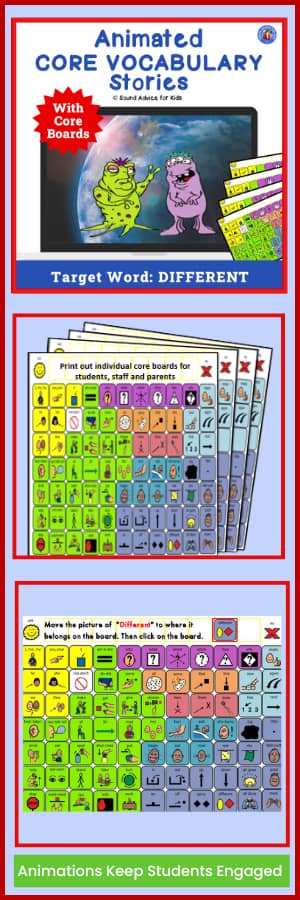 How It Works: Students select aliens throughout the story. Wrong choice? A red X appears. Correct alien? It animates and flies to the planet! The word "DIFFERENT" highlights on digital core boards as students practice locating it.