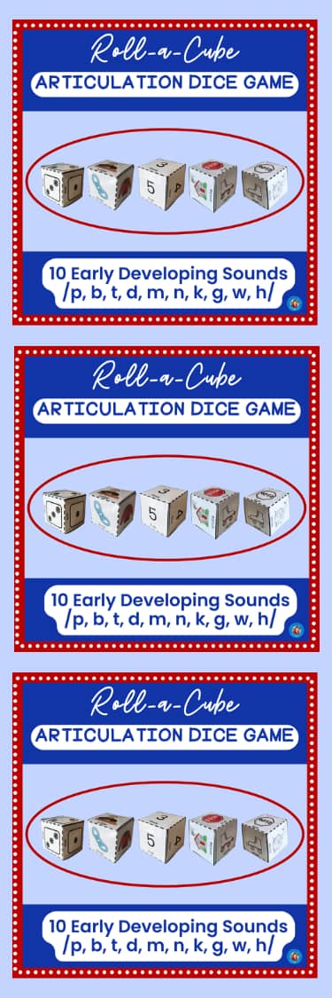 Looking for hands-on articulation activities for speech therapy? These dice cubes help PreK-1st grade students practice early speech sounds and phonemic awareness. Perfect for SLPs, SLPAs, and teachers in sessions, groups, or as homework.