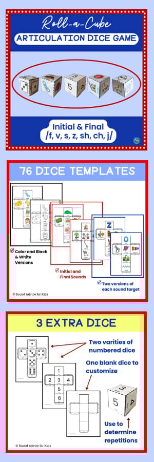 Grab this fun, hands-on articulation game for speech therapy sessions. These articulation dice cubes help students build phonemic awareness skills and practice fricative and affricate sounds in initial, final, and mixed positions, making them perfect for PreK–1st grade speech therapy. It's a print-only resource ideal for SLPs, SLPAs, and early childhood teachers and works well for individual sessions, small groups, or articulation homework.