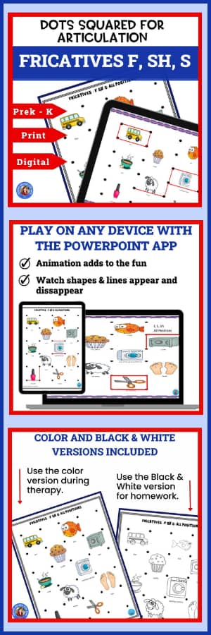 Articulation games add an element of excitement to speech therapy sessions, and this interactive resource delivers! Target /f/, /s/, and /sh/ sounds while addressing stopping of fricatives through engaging practice in initial, medial, and final word positions. Both print and digital versions available for maximum flexibility with your PreK-K students!